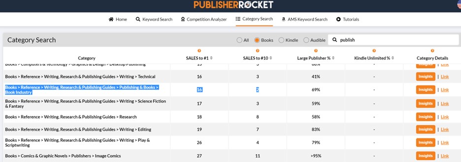 I began with a category search in Rocket for the word “publish.” I sorted the results by the number of book sales needed to get into the top ten of each category: